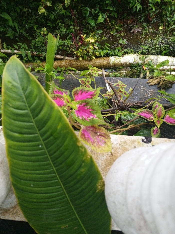 This image captures a close-up view of dense, wet tropical foliage and human-made elements in Khe Sanh Commune, Vietnam. In the foreground, a large, dark green, elongated leaf with prominent parallel veins occupies the lower left portion of the frame. Its right edge exhibits a slight yellowish discoloration. To the right of this leaf, a curved, white, textured object, likely a ceramic or concrete planter, is partially visible, showing some dark speckles. The midground features several smaller plants with distinctive variegated leaves, displaying vibrant pink centers fading to green and yellow edges, indicative of Coleus plants. These are situated within what appears to be a dark, flat planting bed or container edge, supported by a lighter, rough-textured base. Scattered among these plants are thin, dark, dried twigs or branches. The background consists of an intensely green, overgrown area, suggesting a natural and damp environment. Horizontally across the mid-to-background, two sections of cylindrical white pipes, possibly PVC, are visible, partially obscured by dirt and algae, and surrounded by more dense green undergrowth. Below these pipes, the ground appears dark and wet, consistent with moist soil or a small water accumulation. No individuals are present.