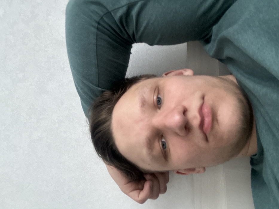 The image displays a close-up, chest-up selfie of a male individual in an indoor setting. The specific location within Perm, Russia, is not discernible from the visual evidence. The male, appearing to be in his late teens or early twenties, has light skin, short brown hair, and blue eyes, with a neutral expression as he looks directly into the camera. He is wearing a dark teal long-sleeved shirt. His left hand is partially visible near his left temple, positioned as if supporting his head, which is slightly tilted. His right arm is bent and extends out of the frame to the right. The background is a plain, light-colored, likely white or off-white, textured surface.