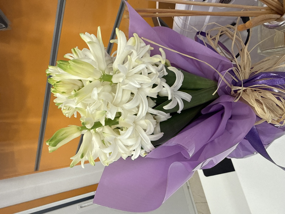 - "An indoor scene depicts a bouquet of white hyacinths, some fully bloomed and others presenting green-tipped buds, wrapped in a translucent purple tissue paper" by FM-OTqD53, licensed under CC BY 4.0