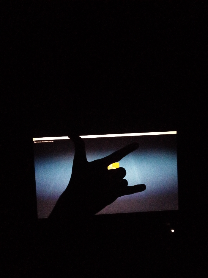 An unknown location in the city of Unknown, Unknown depicts a human hand silhouetted against a luminous computer screen in a darkened environment. The hand is positioned centrally in the lower frame, performing a "rock and roll" gesture with the index finger and pinky extended upwards, while the middle and ring fingers are folded and held by the thumb. The computer screen displays a blue-grey gradient background with a distinct yellow patch towards the right side. A white horizontal bar at the top of the screen partially reveals text, including "Ogiogjio.one | Snapshotbox.com.ng," indicating an active web browser. The background beyond the screen is uniformly black, suggesting minimal ambient lighting. A small, bright white pixel or reflection is visible in the bottom right corner of the overall image.