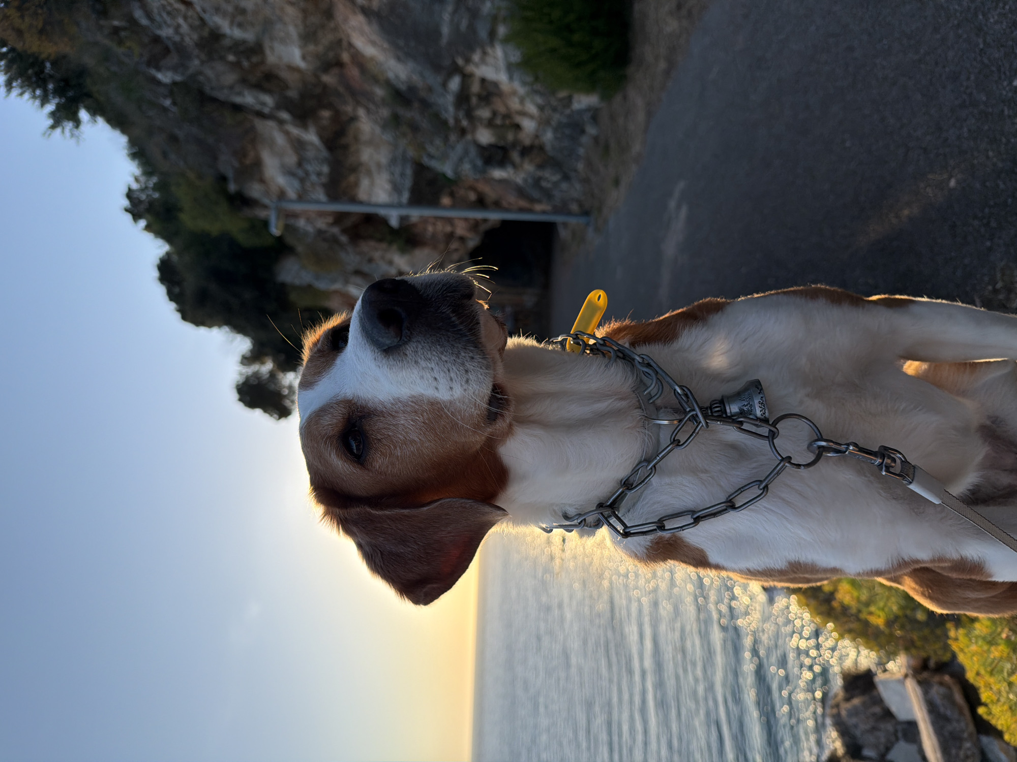 A medium shot depicts a dog, predominantly white and brown, facing the camera and positioned against a natural backdrop. The animal has a brown ear, a white patch on its head, and a black nose. It wears a metal chain leash with a yellow tag attached to its collar. In the background, a rocky cliff with greenery is visible, contrasting with a paved path. The background merges into the sea reflecting the sunlight. The scene is identified as being located in Mirište, Montenegro, based on visual characteristics consistent with the location's geographical features.