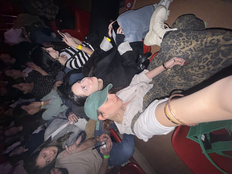 The image captures an indoor event scene within a venue in Yerevan, Armenia, characterized by low lighting and rows of red upholstered seating. In the immediate foreground, the right arm and shoulder of an individual, wearing a white long-sleeved top and multiple metallic bracelets, are visible, suggesting they are holding the camera. A green canvas bag rests on a red seat beside them. In the row directly behind, a female on the left wears a dark green baseball cap, a light-colored collared shirt, and leopard-print overalls; her head is bowed forward. Adjacent to her, a female with long dark hair, wearing a black top, blue jeans, and white combat boots, looks upwards and slightly right, holding a smartphone on her lap and displaying a yellow wristband on her left wrist. In the next row, a bearded male in a light t-shirt and blue jeans holds a clear cup with a dark beverage and a straw, and wears a green wristband, while pointing his right hand to the right. Beside him, a female in a denim jacket holds a similar beverage and exhibits an open-mouthed expression. Further back, another female with dark hair, wearing a light-colored top and a yellow wristband, partially covers her face with her hand. To her right, a female with short dark hair, dressed in a black and white striped shirt, is engrossed in a smartphone held with both hands, also featuring a yellow wristband. Numerous other individuals are visible in the blurred background, seated in similar red chairs, some observing the stage area and others engaged with personal devices. The overall environment suggests a performance venue such as an auditorium, concert hall, or club. No specific architectural details are present to determine the precise street address within Yerevan.