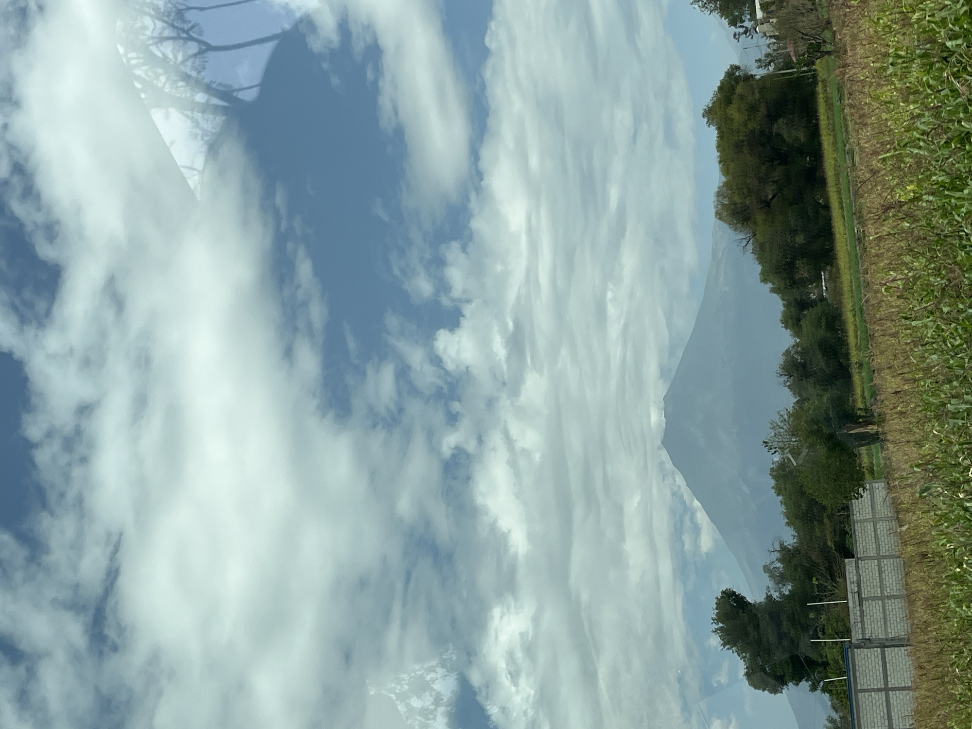 The image depicts a view from inside a vehicle, capturing a scene in Atlixco, Mexico. The sky dominates the upper portion of the frame, filled with white clouds against a blue backdrop, with a possible reflection of a tree branch and head of a person on the windshield. The lower right portion shows a landscape with green vegetation, trees, and a brick wall. A mountain is also seen through the glass.