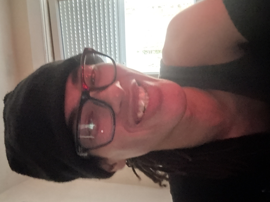A person with fair skin, wearing glasses and a black beanie, smiles towards the camera. They have dreadlocks and wear a black shirt. The background includes a window with closed blinds and a plain wall. The image is tilted at an angle. The person's face is well-lit, revealing their teeth in the smile. Reflections are visible in the glasses.