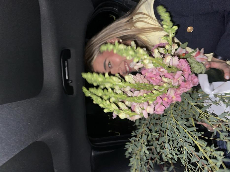 A blonde woman smiles, half obscured by a large bouquet of flowers featuring pink snapdragons and eucalyptus. She wears a yellow top and a navy jacket with a gold button. The background shows the interior of a dark car, including a black grab handle. A white ribbon can also be seen attached to a flower arrangement.