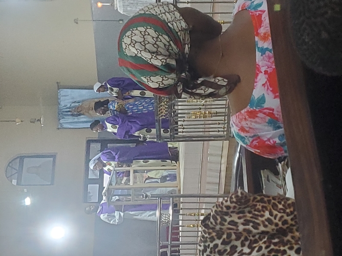 A church setting shows a group of individuals standing behind a metal railing. Each person is wearing a purple robe. A woman with a Gucci-patterned headscarf and a floral-patterned dress is shown in the foreground, and another person wearing a leopard-print patterned dress is partially shown. A picture hangs on the wall in the background.