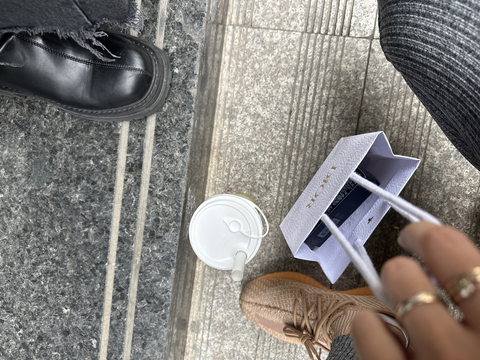 The image presents a ground-level view of an outdoor urban environment in Yiwu, China, depicting the lower extremities of two individuals and associated items. The ground comprises two distinct sections: an upper dark grey speckled granite surface with two parallel lighter grey bands, and a lower lighter grey speckled paving featuring multiple parallel linear grooves. On the left, a person's left foot is visible, wearing a brown athletic shoe with a textured knit upper and a prominent ridged sole. Adjacent to this foot, a hand with at least four rings on two fingers grasps the white string handles of a small white shopping bag. The bag displays an inverted "DIOR" logo in gold lettering and contains a dark blue rectangular product box. Nearby, a clear cup with a white lid and straw, containing a yellowish liquid, rests on the ground. On the upper right, a person's right foot is visible, wearing a black, chunky-soled boot with a visible stitched seam across the forefoot. Above the boot, a section of distressed dark fabric is present. A dark grey ribbed fabric, likely part of a garment, occupies the lower right corner of the frame. The scene captures a static moment, with items placed on the paved surface.