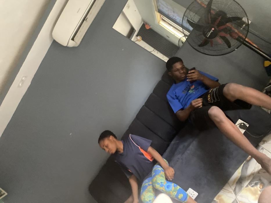 Two people are sitting on a dark gray sofa. One person wears a blue shirt and black shorts with white lettering, looking at a phone. The other person, in a navy blue and orange shirt and blue and yellow floral leggings, is leaning back on the sofa. A large black fan stands in the background, near a window. A white air conditioning unit is mounted high on the gray wall. A white electrical outlet is visible near the bottom edge.