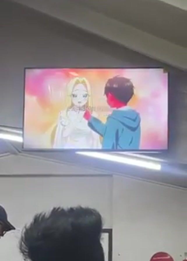 television screen displaying an animated scene, likely from an anime series. The scene transitions through several images, featuring various anime characters. The video is taken from below, showing the back of a person's head in the foreground. The location appears to be a commercial space, possibly a barbershop or similar establishment, with beverage coolers visible along the bottom of the shot. The lighting is provided by overhead fluorescent fixtures.