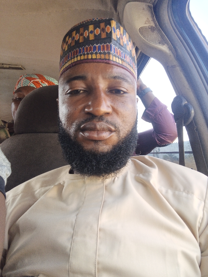 The image depicts the interior of a motor vehicle, likely a selfie taken by the primary subject. No specific landmarks or external environmental details are present to pinpoint a precise location within Akwanga, Nigeria, beyond the vehicle's interior. In the foreground, a male individual with dark skin, a full black beard, and a neutral expression looks directly at the camera. He is wearing a dark, multi-colored patterned cap with geometric designs (black, yellow, orange, white, and maroon trim) and a light beige, collarless, long-sleeved garment. Behind and to the left of the primary subject, the top of another individual's head is partially visible, adorned with a multi-colored headwrap featuring orange, green, and white patterns. To the right of the primary subject, a forearm wearing a light blue wristband or watch, extending from a maroon long-sleeved garment, is visible against the vehicle's interior door pillar. The vehicle's interior features a light-colored ceiling panel, a speaker grille on the upper right door pillar, and light-colored plastic trim. A blurred outdoor background, including hints of distant terrain and bright sky, is visible through the window on the right side of the vehicle.