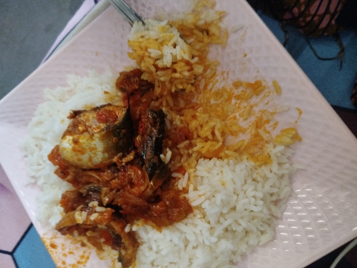 This scene is located in the city of Mape, Nigeria. A light pink, rectangular plate with a raised diamond pattern holds a meal consisting of white rice, a red-orange stew, and pieces of fish and a half-cut egg. A silver fork is visible in the upper center, lifting a portion of rice mixed with the red stew. The stew covers a significant portion of the rice on the left side of the plate, with some red-orange residue visible on the lighter, textured surface of the plate. The background features a blurred blue and patterned fabric, suggesting an indoor setting.