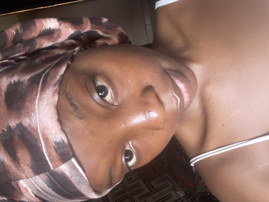 A close-up, frontal portrait features a dark-complexioned individual, presumably female, with her head angled slightly downwards and to the right. She wears a brown, black, and light-toned animal-print headscarf that covers her hair. A white spaghetti strap from a garment is visible over her left shoulder. Her eyes are open, with a direct gaze. Her lips are slightly parted. The subject's skin exhibits natural highlights on the forehead, nose, and lips, indicating a light source from the front-right. The background is out of focus, revealing a dark, geometric pattern on the left and a lighter, indistinct area on the right, consistent with an indoor setting. The specific location in Lokoja, Nigeria, is not discernable from the visual evidence presented in the image.
