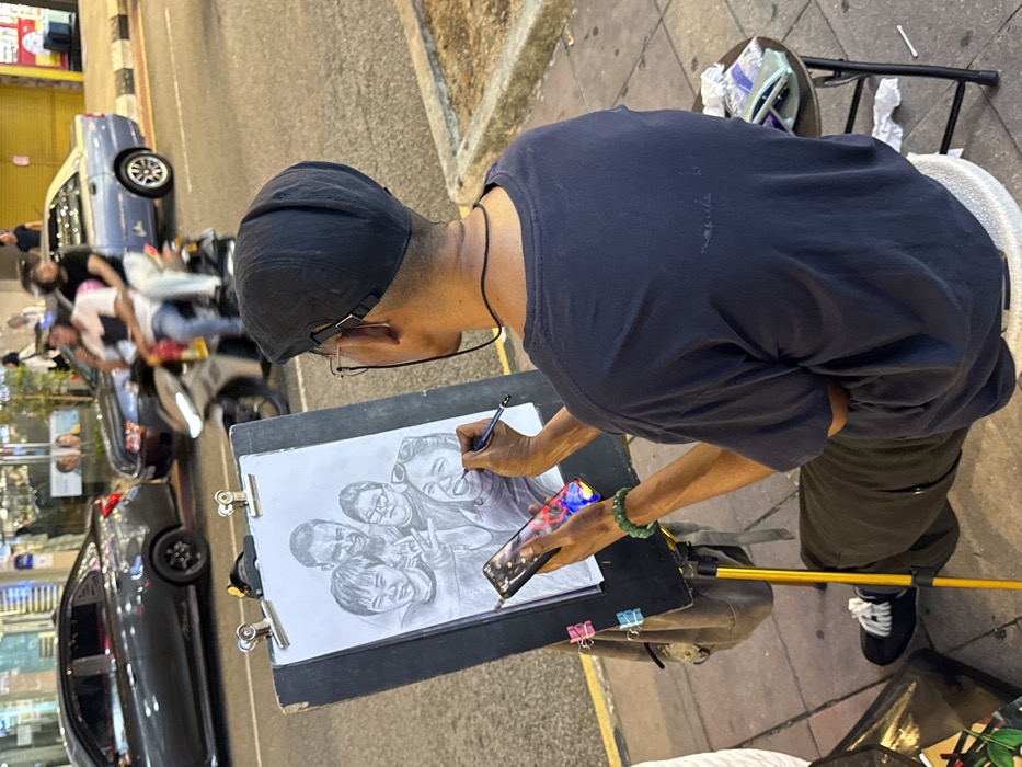 An artist is captured from above, intensely focused on their craft. They wear a dark t-shirt and cap, with eyeglasses perched on their nose. A sketch of a group of people is being drawn on a clipboard, using a pencil. In the artist's other hand is a smartphone. The sidewalk scene includes parked cars and pedestrians blurred in the background. A metal stool is next to the artist and drawing equipment.