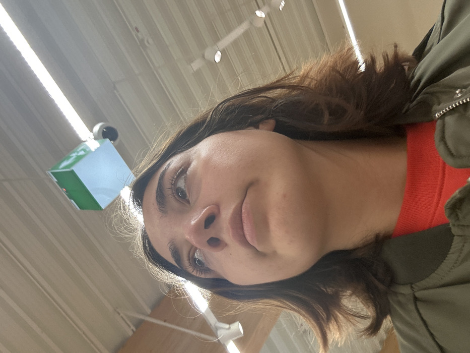 This image captures an interior view of a commercial establishment in Kehl, Germany, from a low-angle perspective. The primary subject is an individual, visible from the chest up, occupying the lower foreground. This person exhibits medium brown, shoulder-length hair and is dressed in a red crew-neck top underneath a dark olive-green bomber jacket featuring a metallic zipper pull. Their head is tilted backward, with their gaze directed upwards and towards the right side of the frame. The ceiling above is composed of white suspended grid panels, illuminated by both linear fluorescent light fixtures and circular spotlights. A rectangular green and white sign, consistent with directional signage, is suspended from the ceiling in the upper-middle area of the frame. A small, dark security camera or sensor is affixed to the underside of this sign or in its immediate vicinity. A light-colored wooden support beam is also visible on the left side of the ceiling structure.