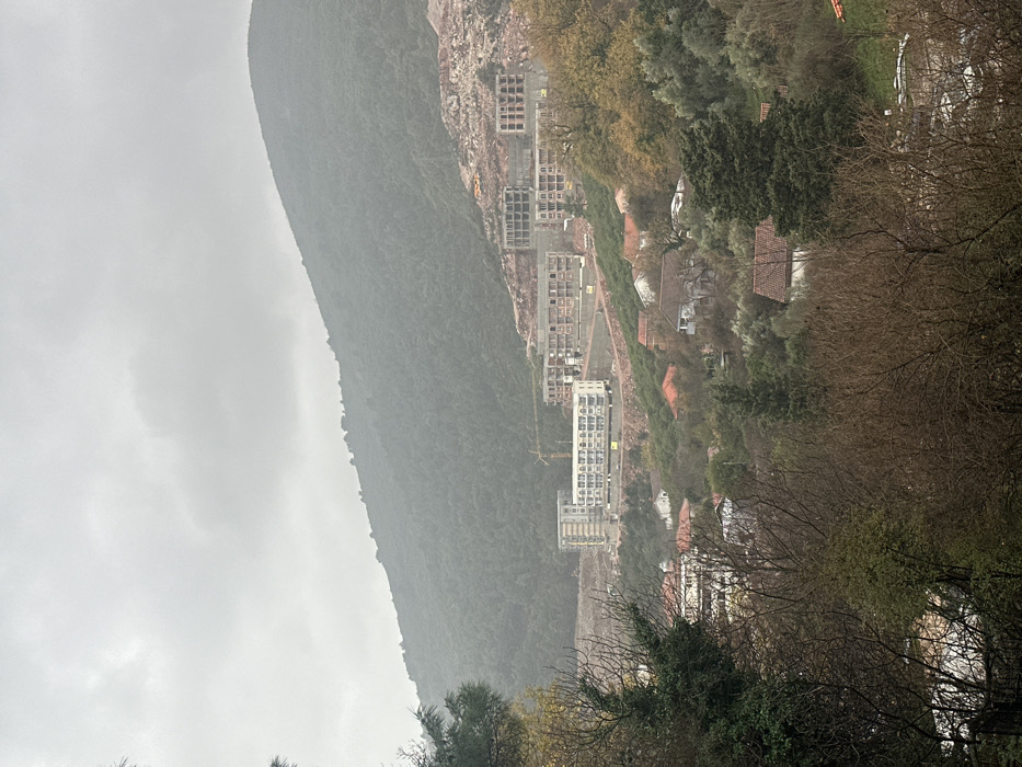 The image presents a panoramic view of a hilly landscape in Podostrog, Montenegro, under a uniformly overcast, light grey sky. A large, densely forested mountain dominates the background, exhibiting a muted green hue, indicative of a damp or hazy atmosphere. In the midground, extensive construction activity is visible across multiple terraced slopes. On the left, a multi-story building, appearing largely complete with light-colored exterior elements, is situated on a leveled platform, with a yellow tower crane positioned behind it. To the right of this, several other multi-story structures are in various stages of concrete frame construction, spread across reddish-brown excavated earth. A yellow construction vehicle, possibly an excavator, is present on one of the higher, cleared sections. Below these construction sites, an established residential area extends across the lower slopes. Numerous two-to-three-story houses, characterized by white or light-colored facades and predominantly red or orange tiled roofs, are nestled amidst scattered trees and smaller pockets of vegetation. The immediate foreground is occupied by a dense layering of trees and bushes. Many trees display bare, dark brown branches, suggesting a dormant season, while others retain evergreen foliage, particularly a prominent dark green conifer branch on the far left. No individuals or discernible human activity are present in the scene.