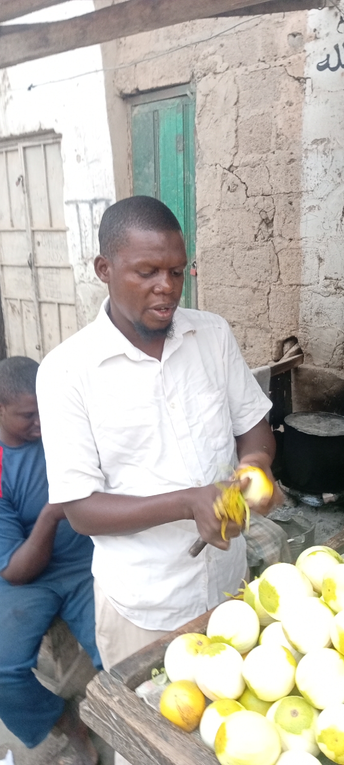 A man peels a yellow fruit with a knife in front of a pile of similar fruits. He wears a white button-down shirt and light-colored pants. Another man is seated to his left, wearing a blue shirt and jeans. Behind them, a building with a green door and brick wall is visible. A black pot sits on a stove-like structure in the background. The scene is likely an outdoor market or food preparation area.