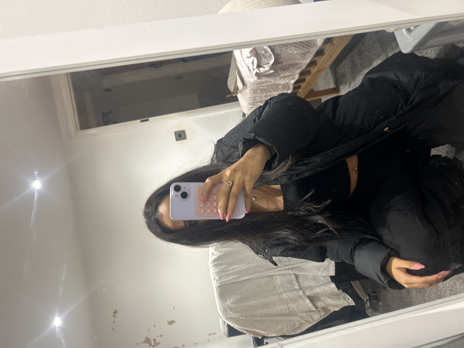 An individual is depicted taking a mirror selfie in an indoor residential setting. The specific location in Winslow, United Kingdom, cannot be determined from visual information within the image. The subject is a female with long, dark hair, positioned in a crouch or squat. Her face is partially obscured by a light purple smartphone, held in her right hand, which features a pink circular 'pop-it' style case. Her left hand, with pink manicured nails, is visible resting on her leg. She wears a black puffer jacket over a black ribbed crop top, revealing a navel piercing, and black baggy trousers. A silver ring is visible on her left ring finger, and a silver heart-shaped pendant hangs from a necklace. The environment includes a white wall with visible areas of peeling paint/plaster on the left side. The white ceiling has two active recessed spotlights. The floor is covered with a dark grey carpet. To the left of the subject, folded light-colored textiles, possibly towels or clothing, are visible. To the right, a wooden bed frame with light-colored bedding is partially reflected. A closed door with a dark rectangular wall fixture, possibly a light switch, is also visible in the mirror's reflection.