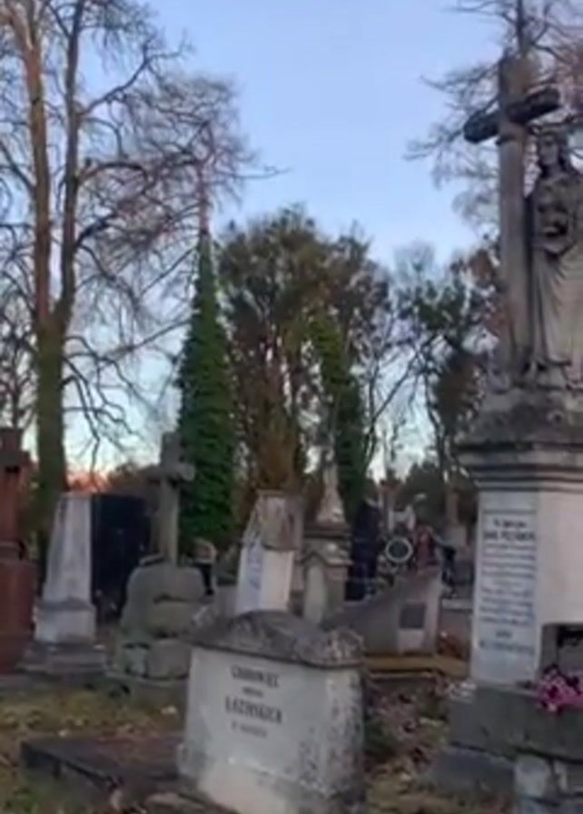cemetery. A stone statue of a woman holding a cross stands atop a tombstone. Next to it is another tombstone with a statue of a figure carrying a cross. Other tombstones and trees are in the background. There are flowers and candles on the tombstones. The sky is blue.