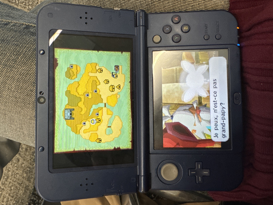 A Nintendo 3DS console is open, displaying two different screens. The left screen shows a map with a desert-like environment, featuring various buildings and terrains. The right screen shows an image of a white, rabbit-like character with red and orange accents. A dialogue box is present in French, reading, "Je peux, n'est-ce pas grand-papy?" which translates to "I can, can't I grandpa?". The console itself is dark blue, with visible buttons and controls. The background suggests the console is on someone's lap.