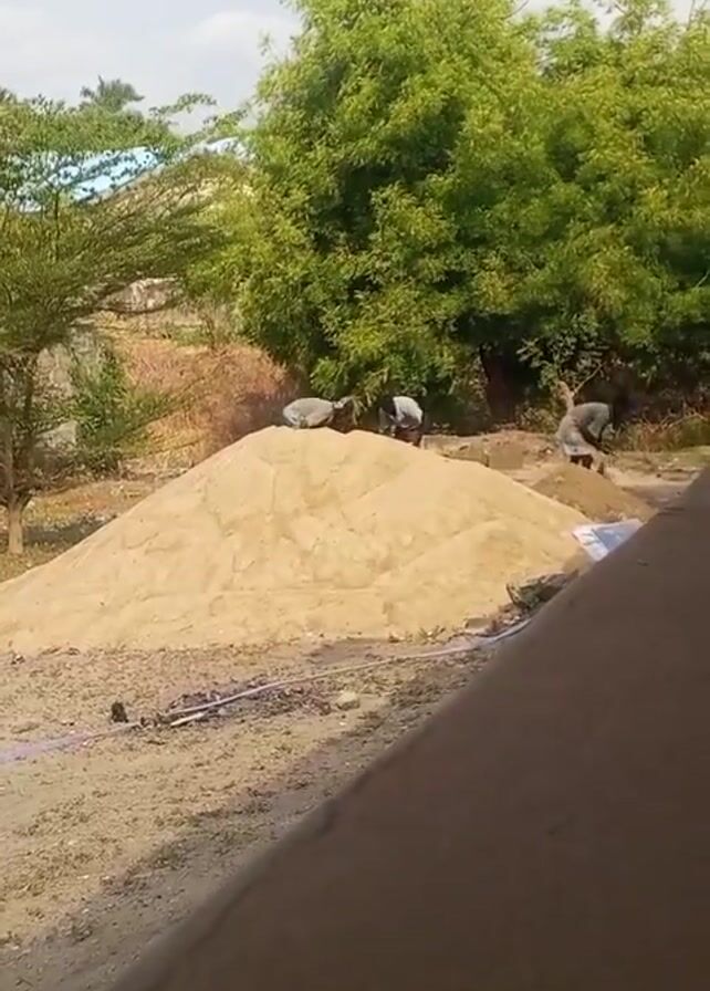 three people working around a large pile of sand on a sunny day. The workers appear to be using tools like shovels or trowels, seemingly moving or shaping the sand. The environment consists of dry, sandy ground with some sparse vegetation and a few trees scattered around. A building edge is visible in the foreground, creating a partial frame for the scene. The overall setting appears to be a construction site or a yard where sand is being stored and processed.