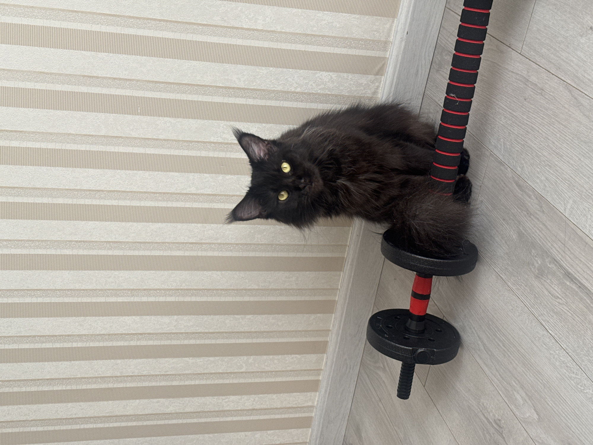 A black Maine Coon cat is lying on top of a black and red dumbbell. The cat is looking at the camera with its yellow eyes. The background consists of striped wallpaper. The location is not specified as Sirius, Russia.