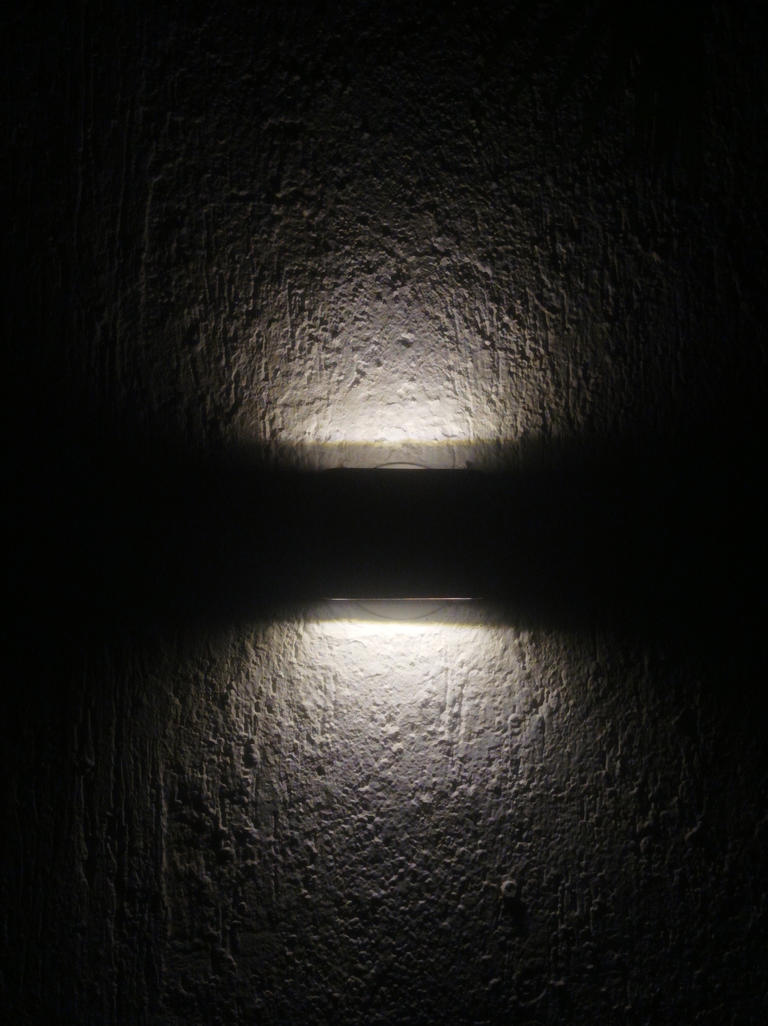 A dark, textured wall is illuminated by a rectangular light fixture mounted in the center