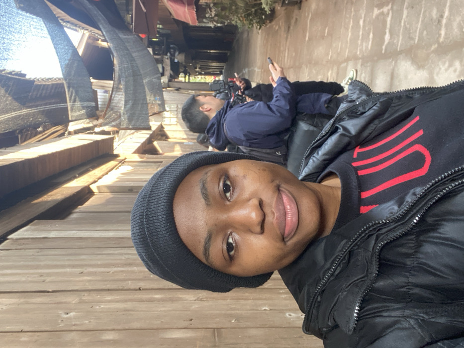 A selfie shows a person with a black beanie and black jacket. Red stripes curve on their black sweatshirt. Another person in a blue jacket lies behind, looking at their phone. They are positioned on a weathered wooden surface. Above and to the left, there's a structure with mesh-like material. The background appears to be a narrow passageway with blurred figures and greenery visible at the end. The lighting is bright, and the overall impression is casual.