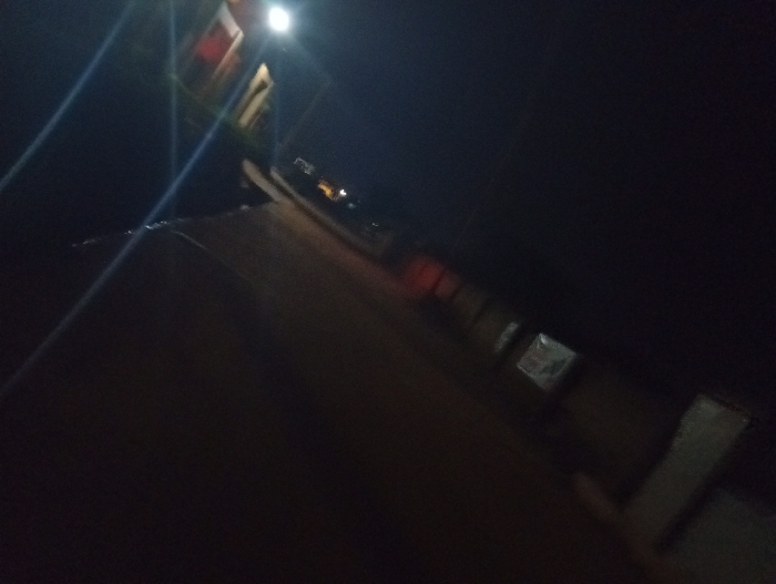 A dark, blurry street scene at night, illuminated by a single, bright streetlight. The road and adjacent buildings are barely visible in shades of brown and black. The street is angled, creating a sense of depth despite the low visibility. Distant building windows suggest a residential area. The overall impression is one of gloom and limited illumination.