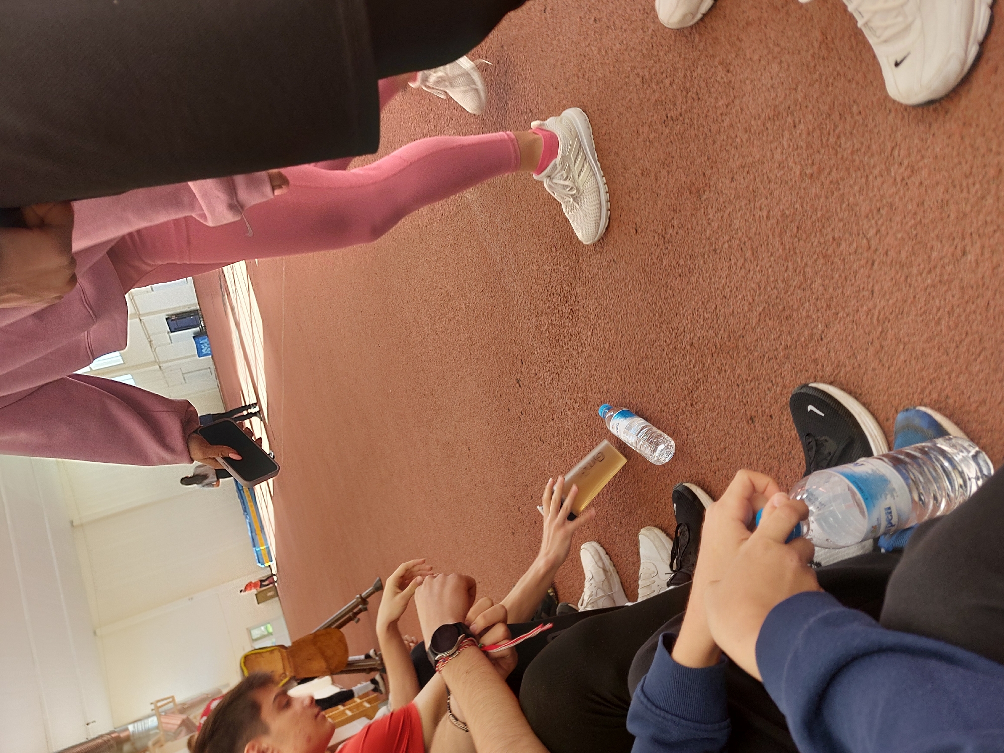 A high-angle shot depicts a group of people on a red running track, likely indoors. The lower part of the frame focuses on individuals seated or kneeling, with visible arms, legs, and feet. Several wear athletic shoes, including Adidas and Nike brands. One person wears pink leggings and a light pink jacket. There are water bottles scattered on the track. In the background, a section of what appears to be an indoor gymnasium can be seen, showing seats and structural beams. This scene may be taken at the sports complex or track field in Vratsa, Bulgaria.