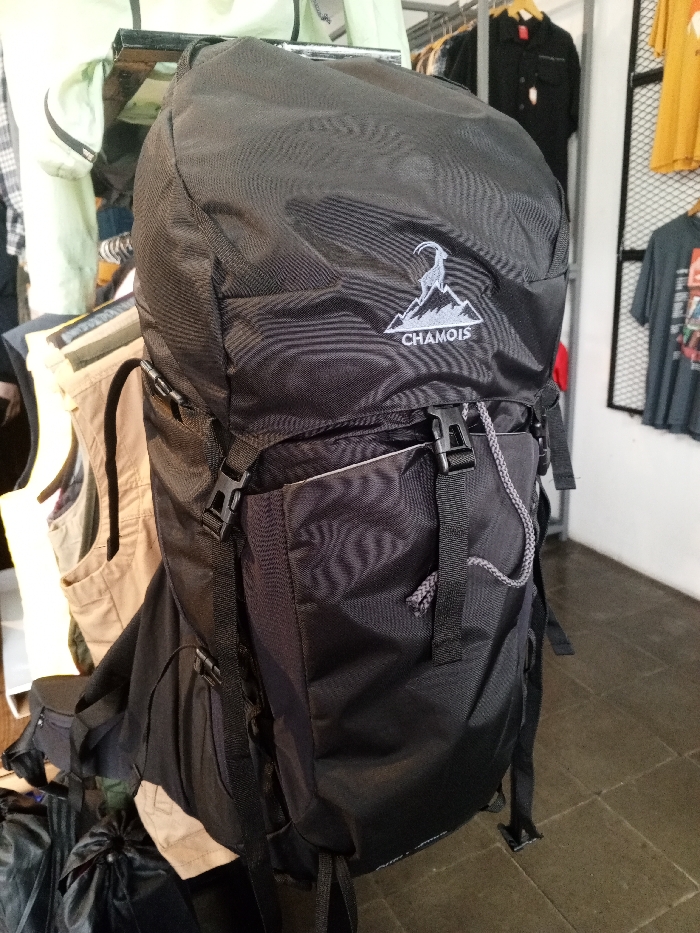 A black "CHAMOIS" brand backpack is displayed in a retail environment in Baza, Myanmar (Burma)