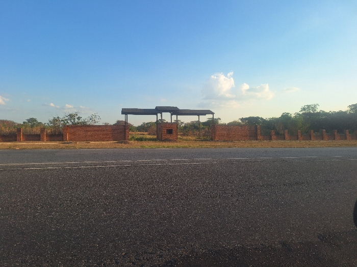 The image depicts an outdoor scene in Orupe, Venezuela. In the foreground, a dark gray asphalt road surface extends across the lower third of the frame, marked by two parallel broken white lines. A small, dark, indistinct object is visible in the bottom right corner. In the midground, a horizontal reddish-brown brick wall structure is situated, featuring a central open gateway about 4-5 meters wide, spanned by a dark, flat canopy roof supported by dark vertical posts. To the right of this main opening, a smaller, standalone brick structure, resembling a guard booth, presents an open rectangular aperture and a similar dark, flat roof on dark supports. Sections of brick wall with vertical pilasters flank these structures. The ground immediately behind the road and extending beyond the structures is dry, light brown earth with sparse, withered vegetation. The background consists of a treeline of varying density and greenery. The sky above is clear light blue with scattered white cumulus clouds, predominantly on the right side. No individuals, animals, or active events are present.