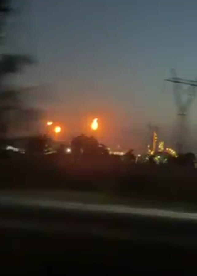 dark landscape at dusk or night. There are lights from a factory or industrial complex visible in the distance. The camera is moving, likely from a vehicle, as trees and other objects in the foreground pass by quickly. The sky is a dark gradient, suggesting the end of daylight. There is no indication of people or any specific activity beyond the lights of the industrial facility.