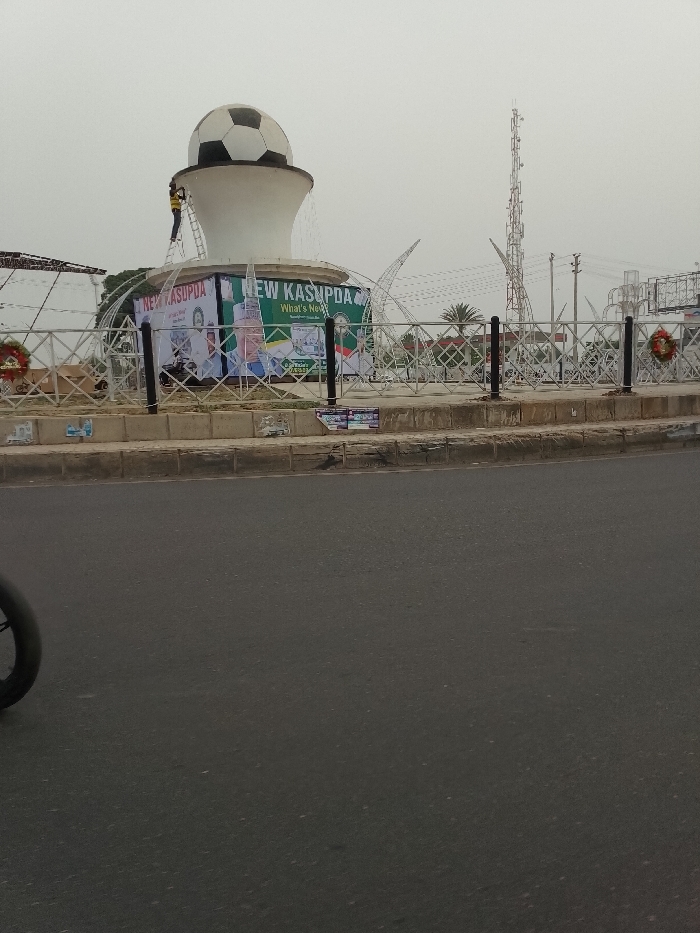 A traffic circle features a large, white structure topped with a black and white soccer ball. A worker stands on a ladder, appearing to perform maintenance on the ball. Banners with "NEW KASUPDA" are attached to the base. A decorative metal fence with small wreaths surrounds the circle. In the background, a telecommunications tower rises. The foreground is dominated by a paved road. A portion of a bicycle tire is visible on the left side.