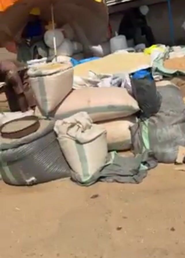 The video depicts a bustling outdoor market scene. Sacks and piles of grains and other goods are spread out on tarps and within a makeshift tent structure. Several people are visible, either standing, squatting, or moving around the goods. The overall environment appears to be dusty or sandy, with simple structures and a fence line in the background. The camera pans slightly, providing a more comprehensive view of the market area.