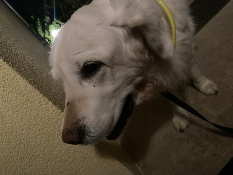 - "The scene depicts a large-breed canine with predominantly white fur, consistent with a Golden Retriever, situated outdoors or in a semi-enclosed exterior space in Truchtersheim, France, during low-light conditions, likely nighttime" by FM-3x3sP2, licensed under CC BY 4.0