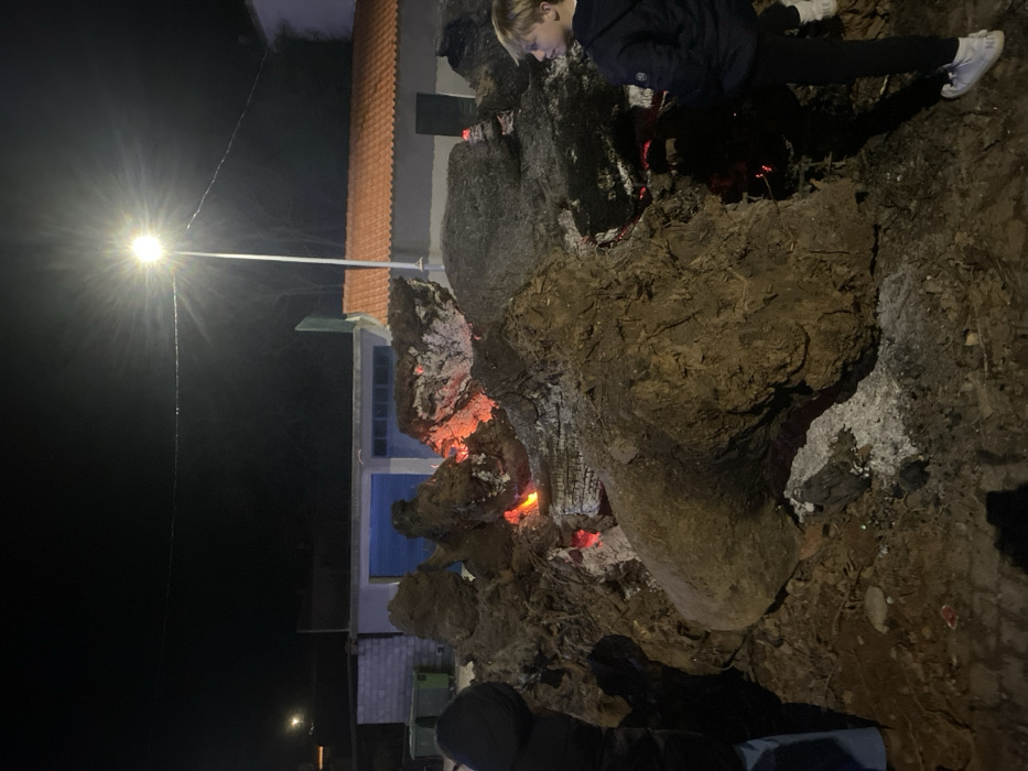 A night scene shows a large, uprooted tree stump burning with glowing embers. A young person in a dark jacket and white shoes sits atop the stump. In the background, a building with a tiled roof is visible under a bright streetlight. Another person, wearing dark clothing, sits in the foreground. The ground around the stump is dark and uneven.