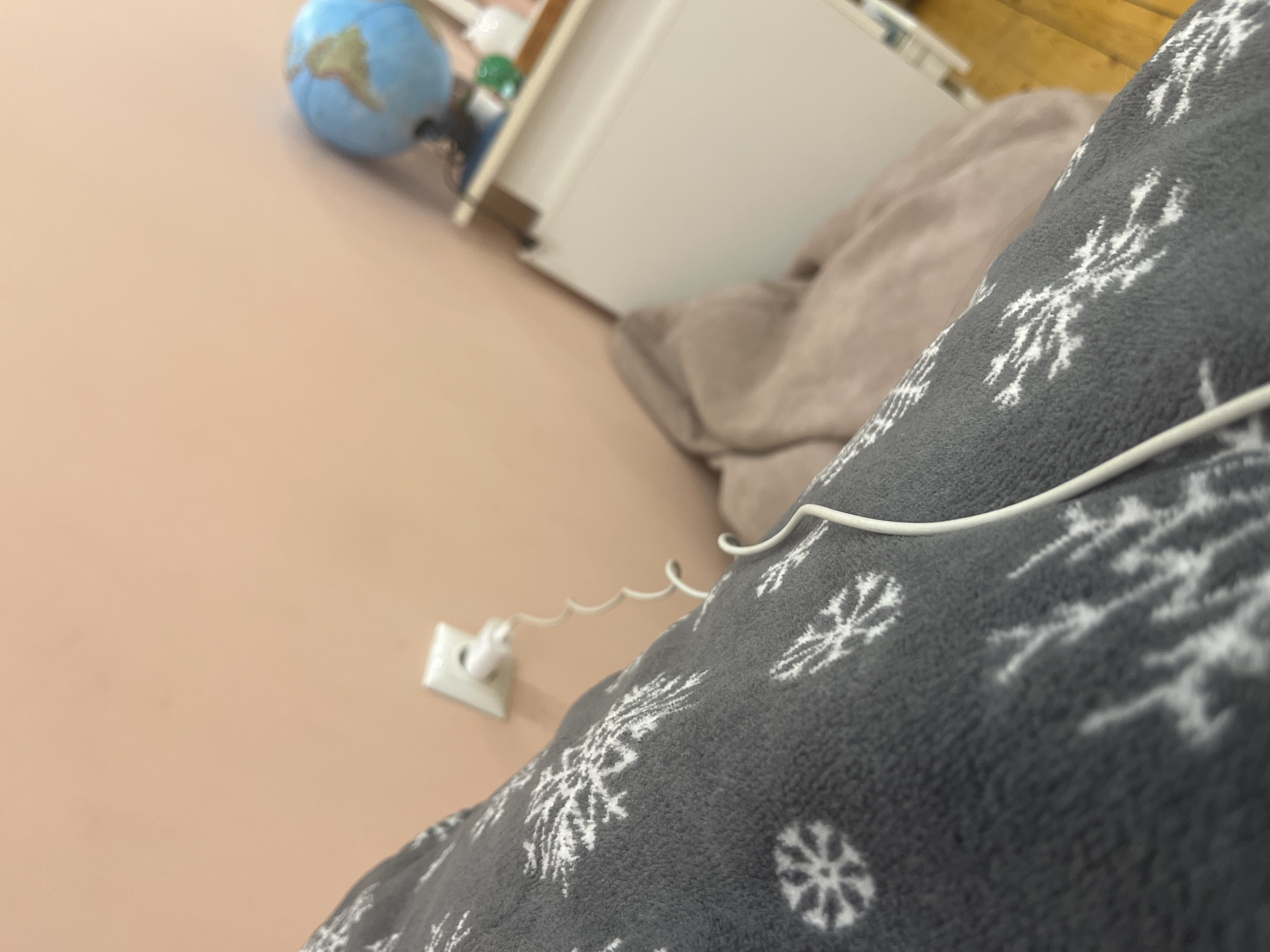 section of a room, focusing on a gray blanket with white snowflake patterns in the foreground. In the background, there's a light pink wall with an electrical outlet and a white coiled cord plugged into it. Further back, there appears to be a white piece of furniture, a light brown blanket, and a globe. The location is claimed to be Pernik, Bulgaria, but there is no contextual information in the image to confirm this location.