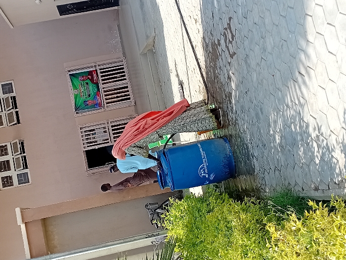 This image depicts an outdoor scene in Kwazailewa, Nigeria, during daylight hours. In the foreground, a woman, dressed in a patterned long gown and a red/orange head covering, is positioned with her back mostly to the viewer, interacting with a blue plastic barrel. The barrel displays white text that includes "SOLVENTEC TRADING UNIT." Water is visibly pooled around the base of the barrel and on the hexagonal paver-brick ground, and a black hose or pipe extends from the barrel, held by the woman. To the left, a row of green bushes runs along the edge of the paved area, partially obscuring a black bicycle. In the mid-ground, two men stand near the entrance of a light-brown building. One man, in light brown attire, leans against the building's facade. The second man, wearing a light blue tunic, stands closer to the entrance. The building features white-framed windows on its upper section and a main entrance with metal security bars or grates. A green and black banner, possibly promotional or political with images of a man and a woman, is affixed to the entrance gate. The ground consists of gray hexagonal interlocking pavers, with strong shadows indicating bright sunlight.
