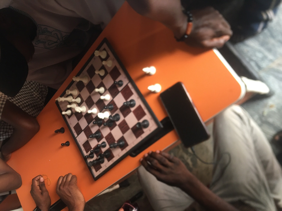The scene depicts an overhead view of an indoor gathering in Minna, Nigeria, centered around an orange rectangular table. A portable chess board, featuring brown and lighter checkered squares, is centrally positioned on the table. Black chess pieces are arranged predominantly on the left side of the board, while white pieces occupy the right side. Three black pawns are off the board, resting on the table to the left of the chess board. Two white pawns are also off the board, situated further to the right. At least four individuals are partially visible. In the upper right quadrant, a person wearing a dark baseball cap and a light-colored garment with blue embroidery is observing the board. In the upper left, two sets of hands are present, one holding a yellow elastic band. In the lower left, an arm and hand are visible, with a white earbud wire extending near the hand. A black smartphone with a dark screen lies flat on the table to the right of the chess board, connected by a visible black charging cable. In the lower right, a hand and wrist are visible, adorned with a dark bracelet featuring orange beads. The floor visible beneath the table is a light-colored, possibly tiled or concrete, surface.