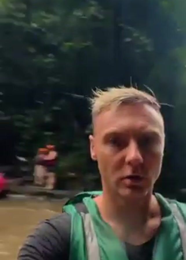 A man wearing a green life vest plunges backwards into a murky river surrounded by lush, green trees