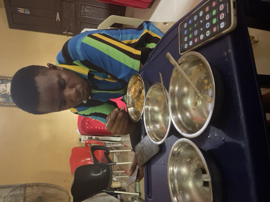 A man in a blue, yellow, and green striped shirt is eating from a silver bowl. On a blue table are three empty silver bowls and another bowl with food. A phone rests on the table's edge. A black chair, a red chair, and a fan are visible in the background, along with a closed door and framed picture on the wall. The room is illuminated with warm light.