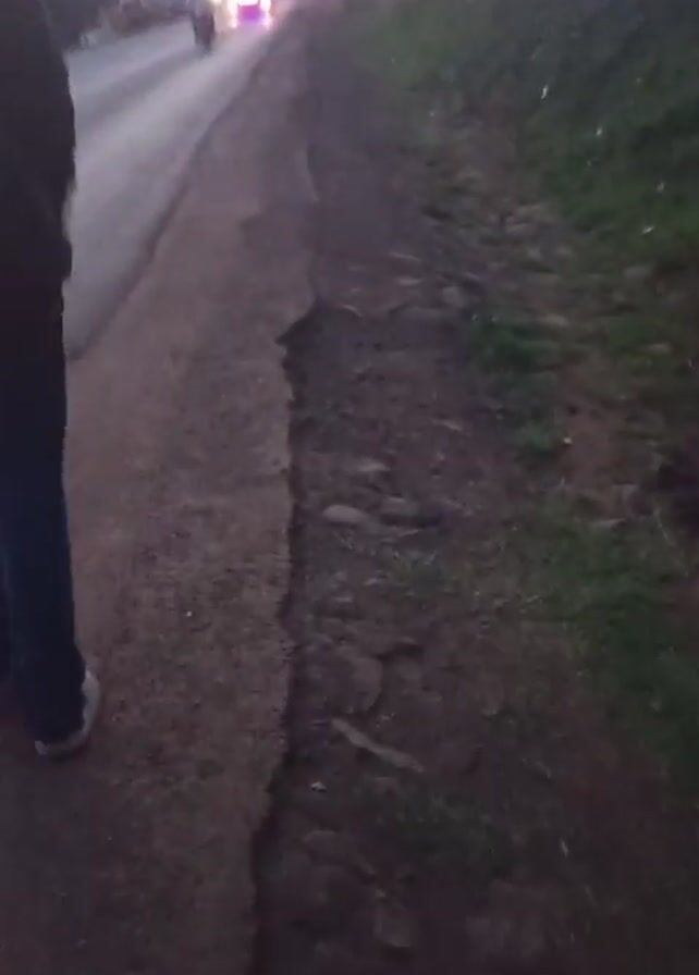 A person wearing a dark jacket, blue jeans, and white shoes walks along a road with a paved section and an unpaved shoulder