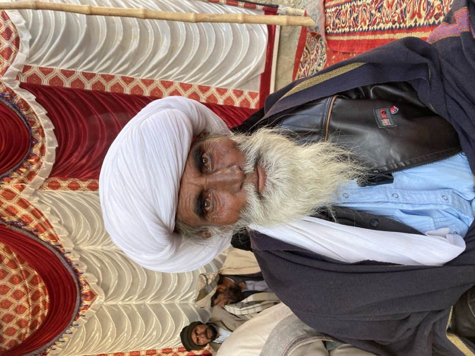 The image depicts an elderly man seated, facing forward, in Quetta City Tehsil, Pakistan