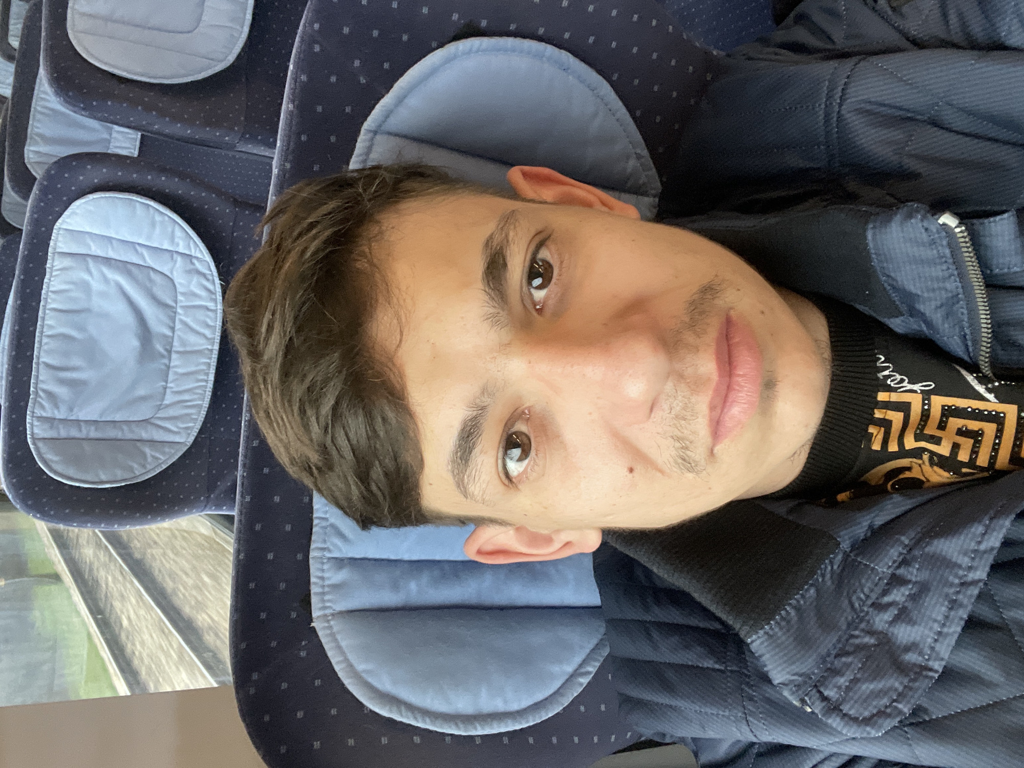 A person with dark hair and brown eyes is photographed indoors, possibly on public transport