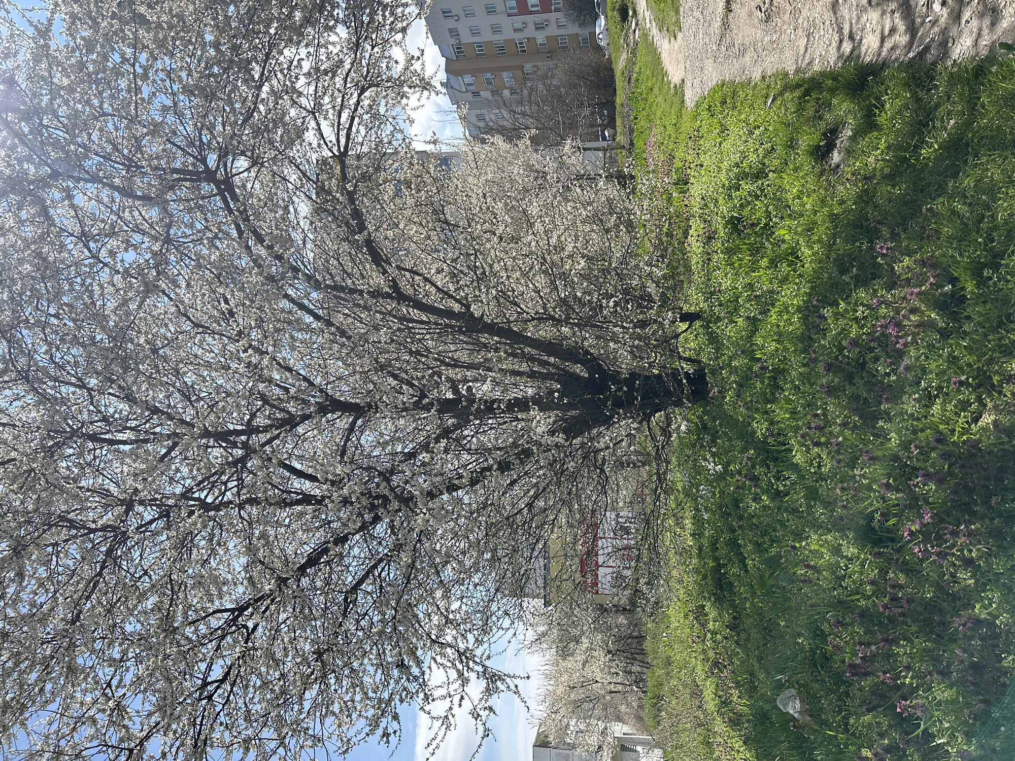A large tree laden with white blossoms dominates the scene, appearing to be in full bloom. Patches of blue sky are visible through the branches. A grassy bank with a variety of green vegetation, including some purple flowers, stretches to the right of the tree. In the background, several multi-story apartment buildings are visible. The scene appears to be in a city environment, most likely the city of Shumen, Bulgaria.