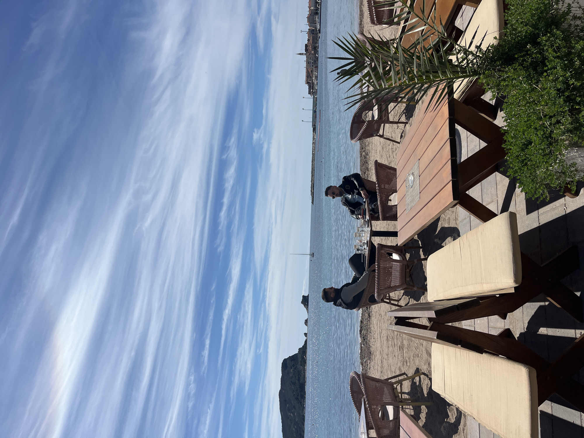 n outdoor beach cafe scene in Budva, Montenegro. Two men are seated at a wooden table with wicker chairs, overlooking the Adriatic Sea. The table also features glassware, indicating possible beverage service. A palm plant and other greenery add to the ambiance of the cafe. In the background, the Budva skyline is visible, with distinctive architectural features. The sky is filled with wispy clouds, and the water reflects sunlight. The foreground reveals paved areas adjacent to sandy patches.