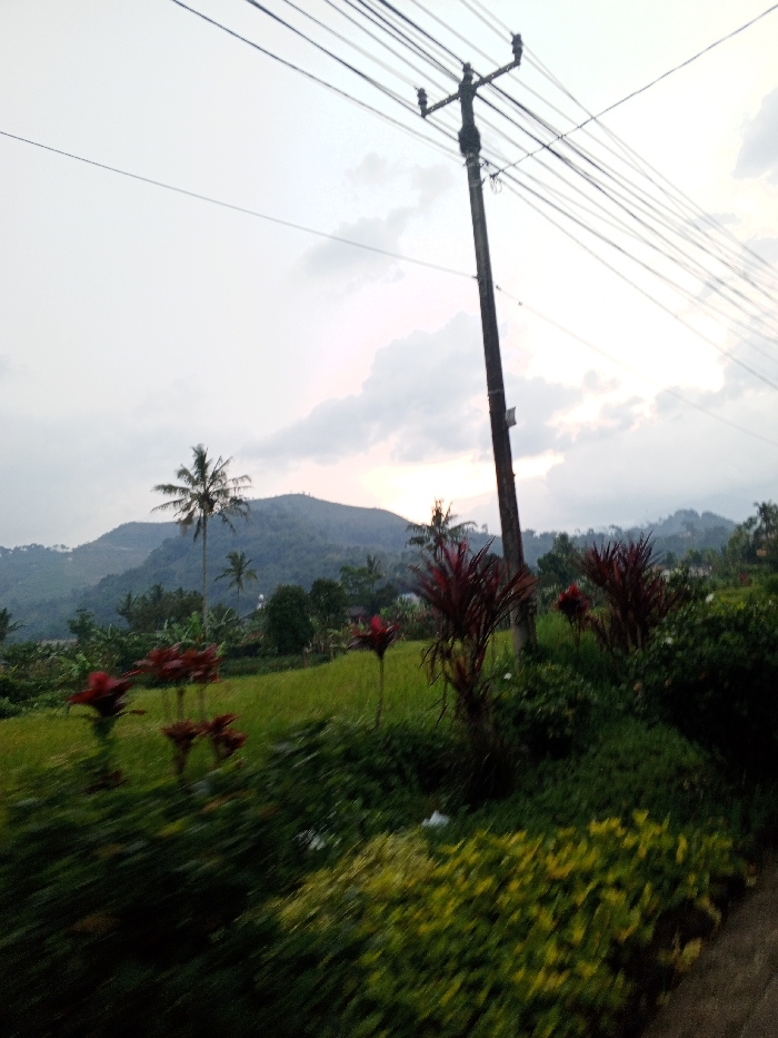 A wide shot captured in Kheda, India, depicts a rural landscape under an overcast sky. A dark utility pole, equipped with insulators and supporting at least eight visible power lines, dominates the right side of the frame, extending vertically from the lower right toward the upper right corner. The immediate foreground on the right presents a sloped embankment densely covered with varied green shrubs and distinct reddish-purple broad-leaved plants. To the left and in the midground, a verdant expanse of what appears to be a cultivated field or terraced agriculture is visible, interspersed with several tall palm trees. The background features layers of rolling, tree-covered hills or mountains ascending toward the horizon under a cloudy, muted sky with diffused light. No individuals or discernible human activity are present. The overall lighting is subdued, indicating either an overcast day or twilight conditions.