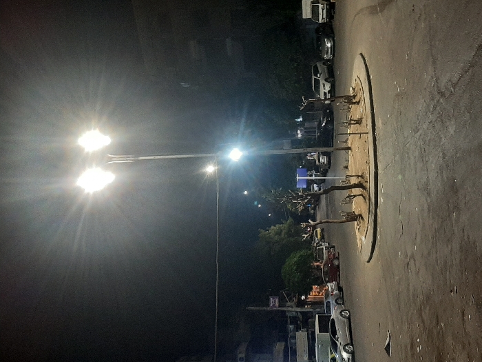 Nighttime urban scene shows a road curving around a circular median. Sparse trees stand in the median. Cars park along the road and in the distance. Overhead, a multi-bulb streetlight casts a bright glow. Buildings line the street in the distance. The asphalt road shows signs of wear and the overall lighting is dark with contrasting bright spots.