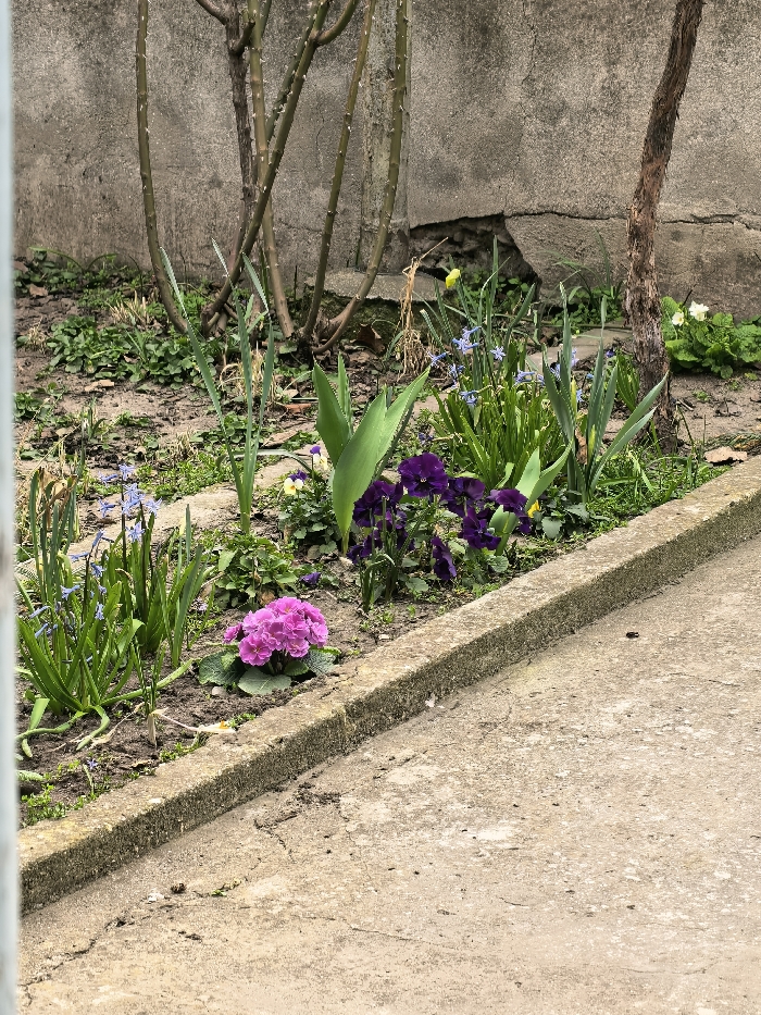 This image depicts a garden bed adjacent to a concrete pathway in Topoli, Bulgaria. The garden bed occupies the middle ground, separated from the foreground concrete path by a raised, light grey concrete curb. Within the garden bed, several types of plants are present. On the left, a cluster of pink primroses with bright green leaves is visible. Scattered throughout the bed, particularly on the left and center-right, are light blue scilla or grape hyacinths. Towards the center and right, dark purple pansies are in bloom, surrounded by various green foliage, including broad leaves and tall, slender, pointed leaves. A yellow flower bud is situated among the blue flowers on the right side of the bed. In the far right background of the garden, a small patch of white flowers, possibly primroses, is observable. The ground of the garden bed consists of dark soil with sparse green ground cover and some scattered dry organic debris. The concrete pathway in the foreground is light grey, showing signs of wear, including minor cracks and surface imperfections. In the background, behind the garden bed, stands a weathered concrete wall. This wall exhibits a significant crack and a missing section of material in its lower central portion, revealing a darker void. Bare, multi-stemmed plant stalks, resembling dormant rose bushes, are visible against the wall on the left and center. A single, slender, dark brown tree trunk or stem is positioned against the wall on the right side of the image. No individuals, animals, or active interactions are present in the scene.
