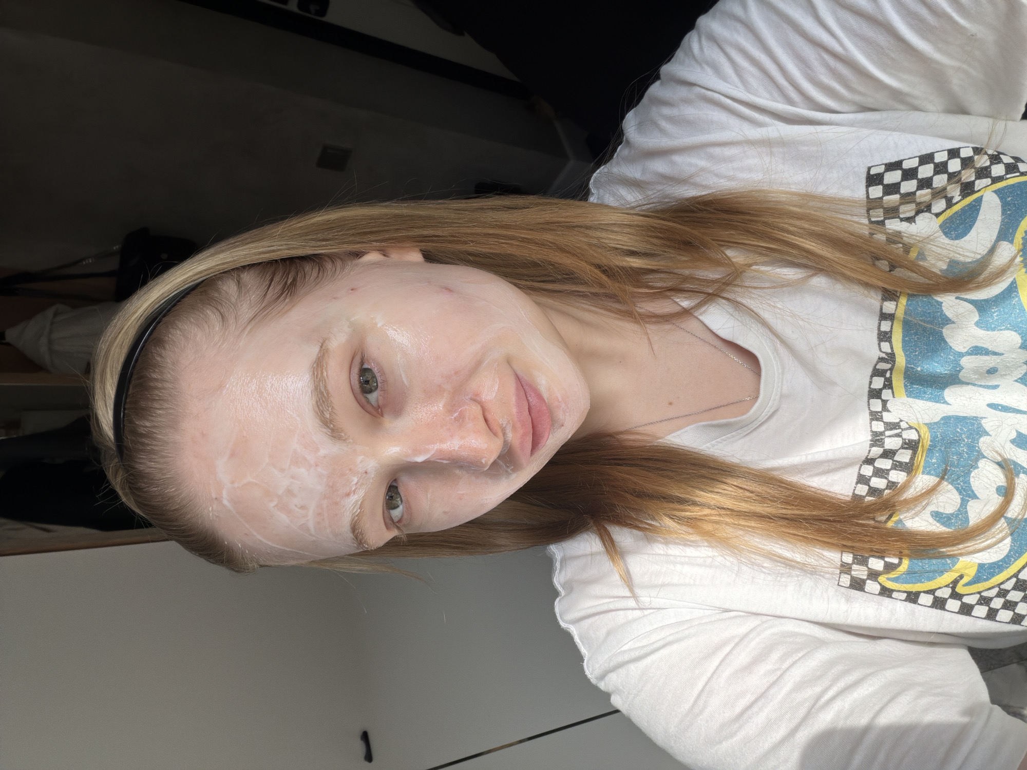 A blonde-haired female subject, appearing to be an adult, is depicted in a head-and-shoulders portrait. Her face is partially coated with a white, creamy substance, consistent with a topical mask, revealing some underlying red blemishes on the forehead and left cheek. She has green eyes and wears a black headband. Her attire consists of a white short-sleeved t-shirt featuring a graphic design with a black-and-white checkered pattern and blue and yellow elements. A thin silver chain necklace is visible. The subject makes direct eye contact with the camera. The background on the left consists of a light grey surface, possibly a door or wall, with a dark horizontal handle. The background on the right is darker, showing indistinct dark furniture, a hanging dark object, and a wall-mounted switch or outlet plate. Strong natural light illuminates the scene from the left. No discernible features within the image identify the location as Rossiyskiy, Russia.